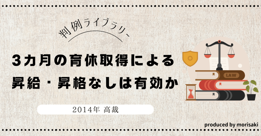 男性看護師は、約3か月間の育児休業を取得しました。取得後、職能給の昇給が行われず、また、昇格試験の受験資格も与えられませんでした。これらの措置は、育児休業を取得したことを理由とする不利益取扱いであり、育児・介護休業法第10条に違反するとして、男性看護師は損害賠償と慰謝料を求めて提訴しました。
