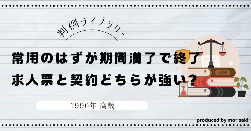 この事件は、 労働契約に期間の定めがあるのかどうか を巡って争われた事案です。労働者Xは、求人票の雇用期間欄に「常用」と記載されていたことから、期間の定めなく働き続けられる契約(無期雇用契約)だと理解して応募しました。しかし、実際は期間の定めのある特別職(有期雇用契約)の募集であったといいます。